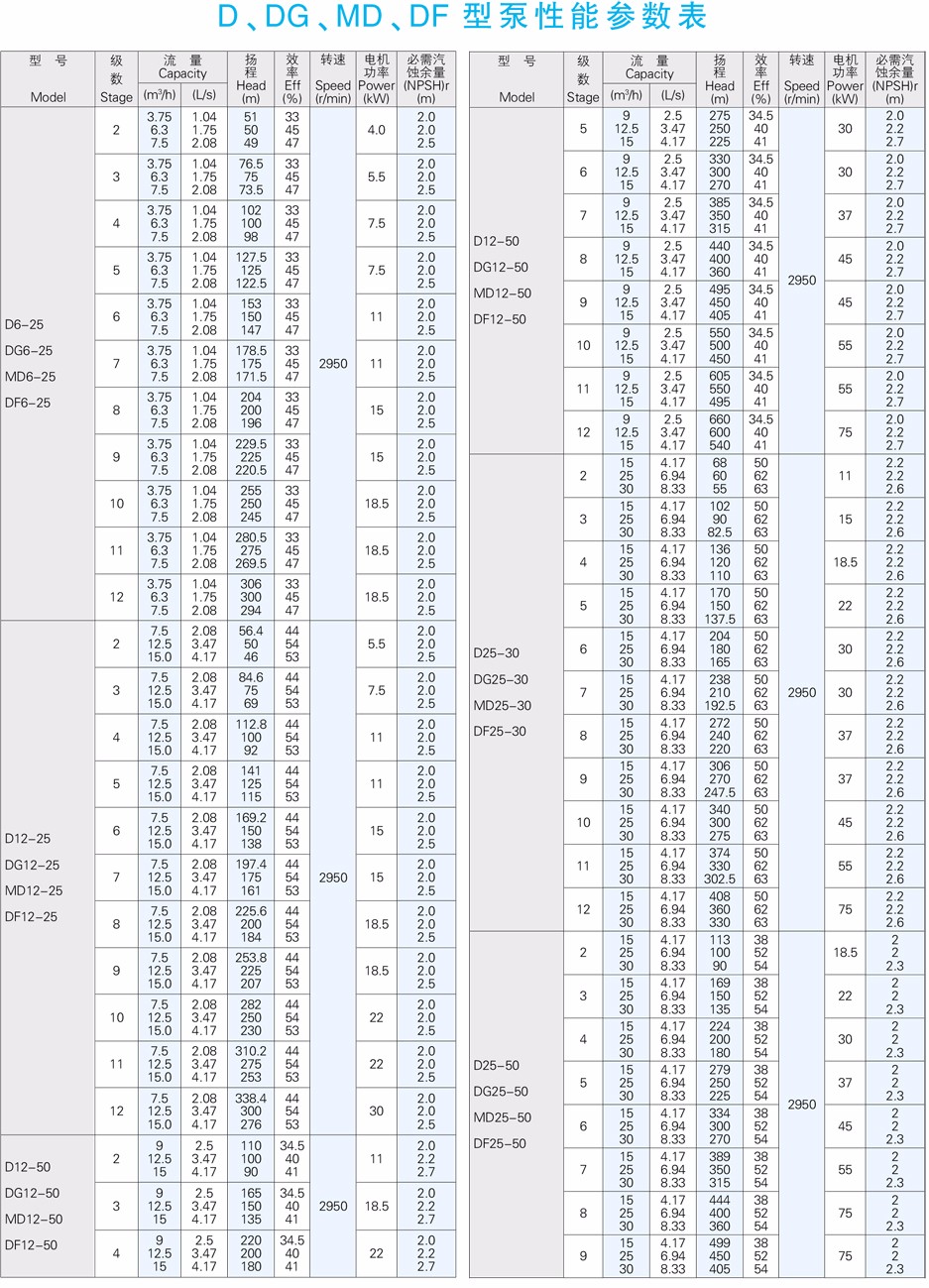 DG型高吸程單吸多級熱水離心泵供輸送清水或物理及化學性質(zhì)類似于清水的其他液體之用。介質(zhì)溫度不大于105℃,適用于小型鍋爐給水或輸送熱水和類似熱水的介質(zhì)。也可根據(jù)用戶要求制作介質(zhì)溫度不大于150℃場合。