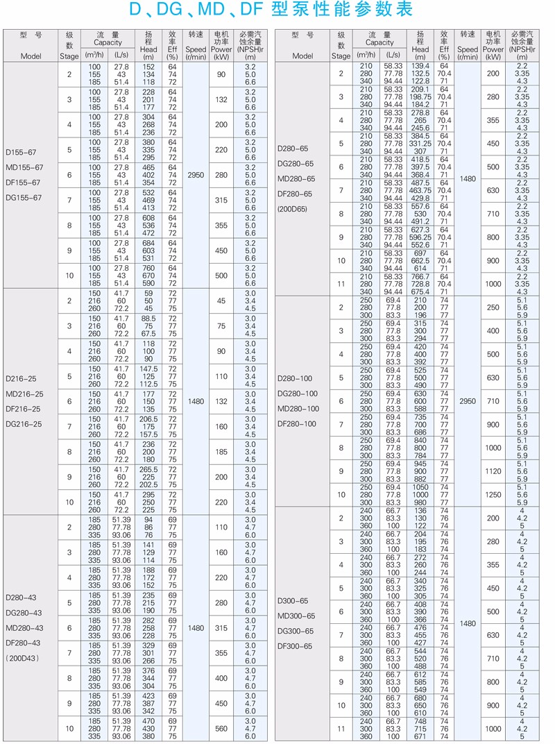 D、DG、MD、DF等系列高吸程泵為臥式安裝,吸入口水平(DG垂直向上),排出口垂直向上。泵的吸入段、中段、吐出段用拉緊螺栓聯(lián)結(jié)成一體。泵由吸入段、中段、吐出段、葉輪、軸、導(dǎo)葉、導(dǎo)葉套和平衡盤等主要零部件組成。轉(zhuǎn)子的軸向力由平衡盤平衡,軸承采用滾動軸承,用潤滑脂潤滑。軸封采用填料密封或機械密封。在密封腔中通入有一定壓力的水起水封作用。從驅(qū)動端方向看,泵為順時針方向旋轉(zhuǎn)。